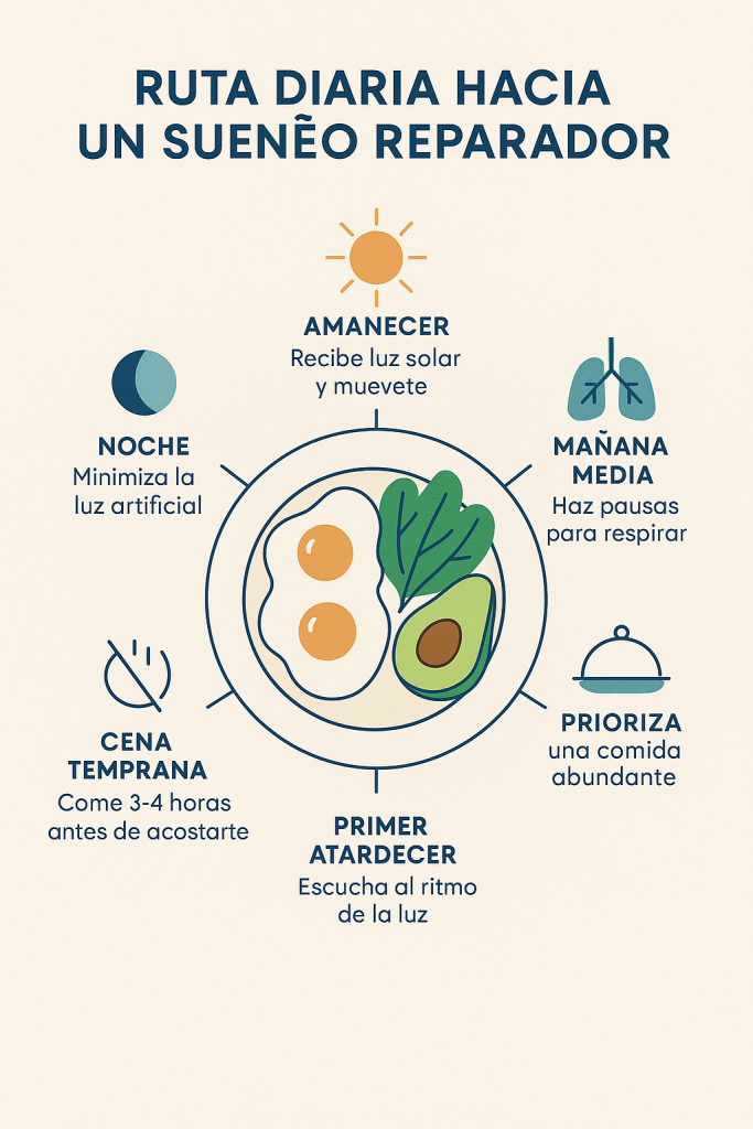El sueño no es solo descanso, es el taller de reparación donde la melatonina pineal, la melatonina mitocondrial, la hormona de crecimiento y la linfa del cerebro ejecutan su coreografía de mantenimiento. Cuando vigilamos la luz que recibimos, el momento y la calidad de nuestras comidas, la regularidad de la respiración durante el día, entregamos a la noche un organismo sincronizado y listo para regenerarse. Esa es la verdadera “medicina gratuita” que la biología nos ofrece: un sueño profundo nacido de decisiones diurnas conscientes.